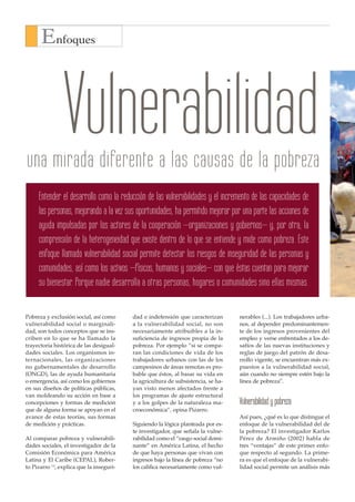 El documento explora el enfoque de la vulnerabilidad social como una forma de entender las causas de la pobreza, enfatizando la importancia de reducir vulnerabilidades y aumentar capacidades para mejorar el bienestar de las personas. Se argumenta que este enfoque permite una comprensión más profunda de las desigualdades y factores que afectan a las comunidades, y propone que el desarrollo debe basarse en las capacidades de las propias poblaciones. También se mencionan las debilidades en las mediciones actuales de pobreza y vulnerabilidad, sugiriendo la necesidad de un análisis más integral y dinámico de la realidad social.