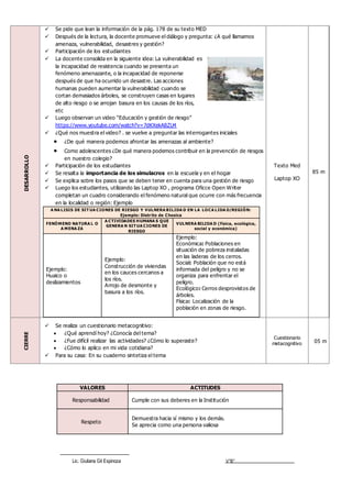 Este documento presenta una sesión de aprendizaje sobre cómo disminuir la vulnerabilidad frente a desastres. La sesión incluye objetivos de aprendizaje, una secuencia didáctica con actividades como la lectura de textos, observación de videos y completar cuadros sobre riesgos. El propósito es que los estudiantes evalúen situaciones de riesgo y propongan acciones para disminuir la vulnerabilidad, como participar en simulacros y reconocer zonas seguras.