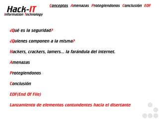 El documento presenta una introducción a la seguridad de la información. Explica conceptos como hackers, amenazas comunes como XSS e inyección SQL, y métodos de protección como firewalls y cifrado. Concluye que la seguridad total no existe y que la educación es fundamental para reducir riesgos.