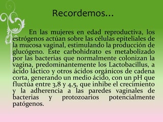 El documento describe diferentes tipos de vulvovaginitis. La vaginosis bacteriana se produce por un desequilibrio de la flora vaginal que lleva a una disminución de lactobacilos y un aumento de microorganismos anaerobios como Gardnerella vaginalis, causando flujo grisáceo con mal olor. La candidiasis vaginal está causada por especies de Candida y provoca flujo blanco espeso y prurito. La tricomoniasis se debe a la infección por Trichomonas vaginalis y genera flujo amarillo-verdos