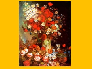 Este documento resume la vida y obra del pintor postimpresionista Vincent Van Gogh. Se divide en secciones que describen sus autorretratos, sus pinturas de la naturaleza como flores y paisajes, sus pinturas de la vida cotidiana, y su estilo postimpresionista caracterizado por colores vivos y pinceladas cortas. También menciona una película que rinde homenaje a su vida.