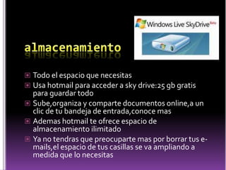 Hotmail ha mejorado su velocidad y funcionalidad, permitiendo acceder a los correos más rápido, organizarlos en carpetas, adjuntar archivos y acceder a 25GB gratis de almacenamiento en SkyDrive. Además, ofrece espacio de almacenamiento ilimitado y protege contra spam y suplantación de identidad. Los usuarios pueden acceder a sus correos desde cualquier dispositivo móvil y integrar otras cuentas de correo como Gmail y Yahoo en su bandeja de entrada de Hotmail.