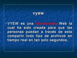 VYEW es una herramienta web gratuita que permite a usuarios compartir archivos y presentaciones en tiempo real, chatear online y dibujar en una pizarra virtual. Los usuarios pueden crear cuentas, iniciar sesiones para compartir información con otros usuarios mediante enlaces de invitación, y tiene usos potenciales para la educación en línea.