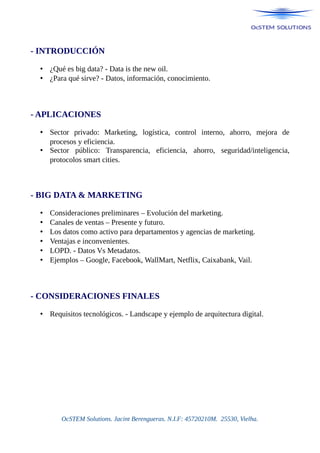 Este documento describe el concepto de big data y su aplicación en marketing. Explica que big data se refiere al análisis de grandes volúmenes de datos para obtener información útil. Detalla algunas aplicaciones de big data en los sectores privado y público, como mejorar procesos, ahorrar costes y ofrecer mejores servicios a los ciudadanos. Además, analiza cómo las empresas pueden usar big data en marketing para comprender mejor a los clientes y ofrecer experiencias personalizadas.