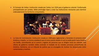 El documento describe la organización política y administrativa del Virreinato del Perú durante la época colonial española. Se estableció un sistema jerárquico encabezado por el Virrey como máxima autoridad, seguido por las Audiencias, Corregimientos y Cabildos. La economía se basó en la explotación de metales preciosos para España siguiendo las políticas mercantilistas. La sociedad colonial se estratificó en españoles en la cima y diferentes grupos de indígenas en la base.