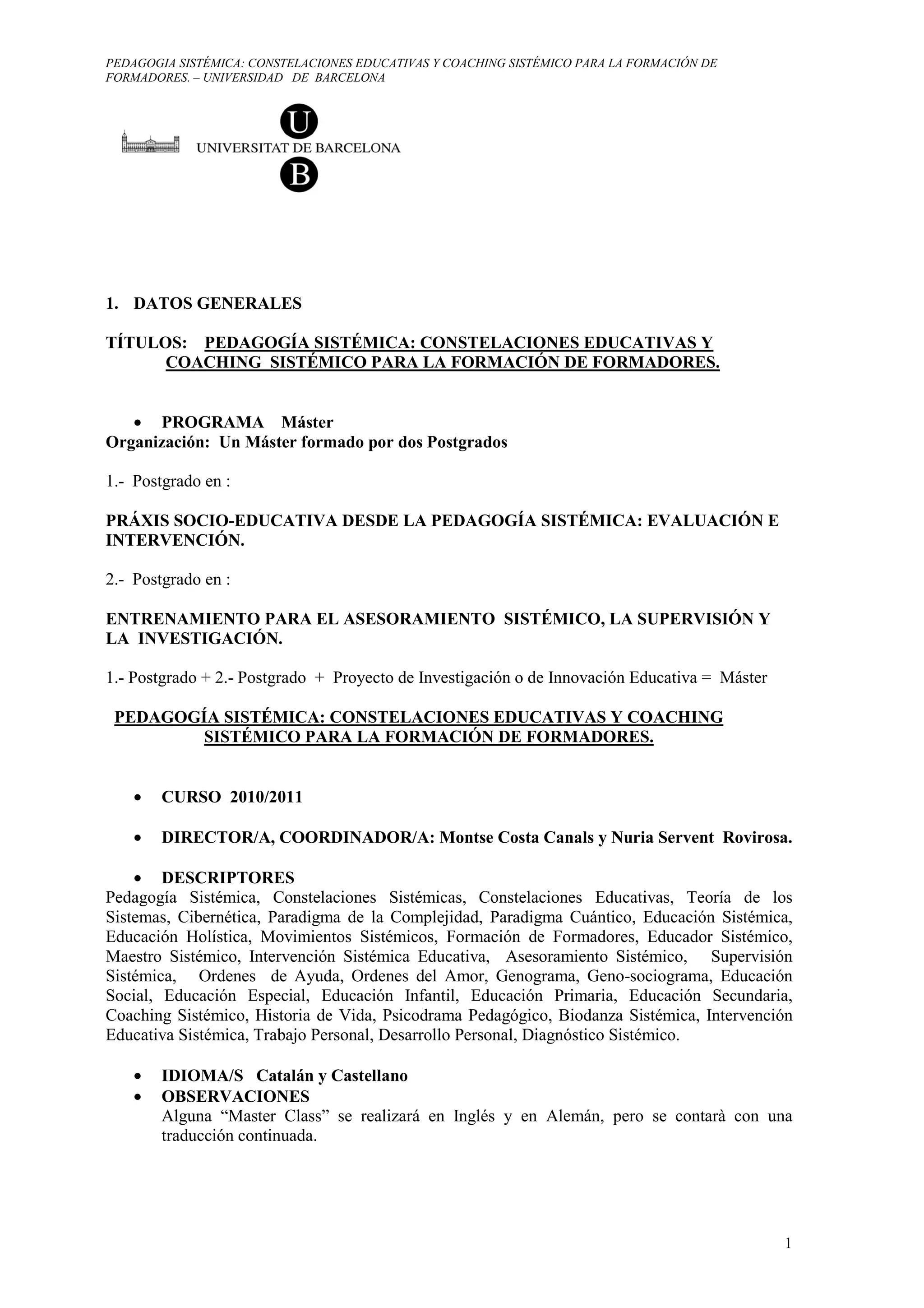 Este documento describe un máster en Pedagogía Sistémica de la Universidad de Barcelona. El máster consta de dos postgrados y un proyecto de investigación. El primer postgrado se centra en la evaluación e intervención desde la Pedagogía Sistémica, mientras que el segundo se enfoca en el asesoramiento sistémico, la supervisión y la investigación. El programa busca formar especialistas en Pedagogía Sistémica para que puedan intervenir en el ámbito educativo y desarrollar competencias como formadores, asesores y super