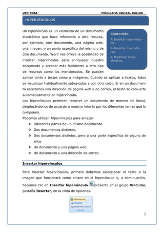 Un hipervínculo es un elemento en un documento electrónico que enlaza a otro recurso como otro documento, página web, imagen o parte del mismo documento. Word permite insertar hipervínculos para enriquecer documentos y acceder fácilmente a otros recursos. Los hipervínculos pueden usarse para enlazar diferentes partes de un documento, dos documentos distintos, un documento y una página web, o un documento y una dirección de correo.