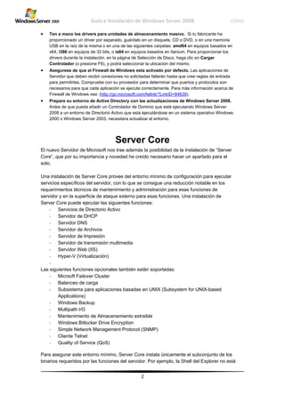 Este documento proporciona una guía paso a paso para instalar Windows Server 2008. Explica cómo descargar e instalar el sistema operativo, recomendando realizar una copia de seguridad y actualizar controladores antes de comenzar. También cubre la configuración del entorno virtual, particiones del disco, idioma e instalación completa del software.