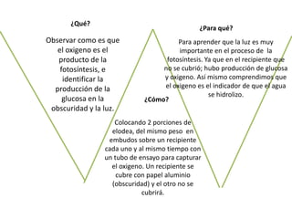 El experimento buscó observar la producción de oxígeno y glucosa durante la fotosíntesis colocando elodea en recipientes, uno cubierto para obscuridad y el otro descubierto. Esto permitió identificar que la luz es necesaria para la fotosíntesis ya que solo el recipiente descubierto produjo oxígeno y glucosa, mostrando que la hidrólisis del agua también ocurrió.