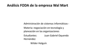 El análisis FODA de Walmart identifica sus principales fortalezas como su reconocimiento mundial, variedad de productos y precios bajos, y sus iniciativas de filantropía. Sus debilidades incluyen la falta de publicidad, demandas por daños ambientales y abuso a trabajadores. Entre las oportunidades se encuentran el crecimiento mundial y las alianzas empresariales, mientras que las amenazas son la destrucción ambiental y la competencia de otras empresas minoristas.