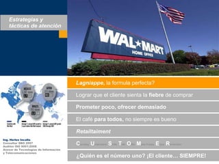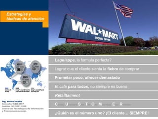 El documento presenta varias estrategias y tácticas para mejorar la atención al cliente, incluyendo ofrecer un "plus" o lagniappe para crear lealtad, hacer que los clientes se sientan entusiasmados de comprar, prometer menos de lo que se ofrece realmente, y siempre poner al cliente en primer lugar.