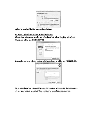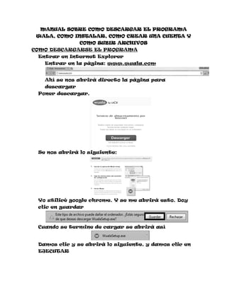 El documento proporciona instrucciones para descargar e instalar el programa Wuala, crear una cuenta de usuario y subir archivos. Explica cómo acceder al sitio web de Wuala para descargar el programa, instalarlo siguiendo los pasos solicitados e iniciar sesión creando una cuenta con nombre de usuario, correo electrónico y contraseña. También describe el proceso para subir archivos seleccionándolos y cargándolos a la cuenta de Wuala.