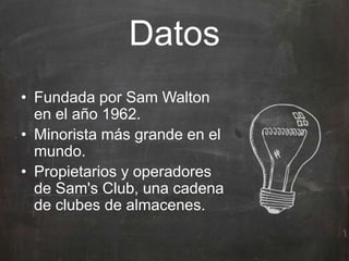 Walmart fue fundada por Sam Walton en 1962 y es actualmente el minorista más grande del mundo, con más de 10,000 tiendas en 27 países que sirven a 200 millones de clientes semanalmente. Opera bajo diferentes nombres en el extranjero como Asda en el Reino Unido, Walmex en México, y Seiyu en Japón. A pesar de intentos fallidos en Alemania y Corea del Sur, Walmart busca expandirse globalmente para continuar creciendo.