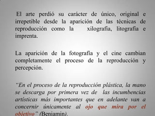 El documento resume las ideas de Walter Benjamin sobre cómo la aparición de la fotografía y el cine cambiaron la naturaleza del arte y su percepción. Con las técnicas de reproducción, el arte perdió su carácter único e irrepetible. La fotografía disputó el rol de captar la realidad con la pintura de manera más efectiva. El cine se consideró un proceso más deshumanizado que el teatro, suprimiendo el aura tanto del actor como del personaje.