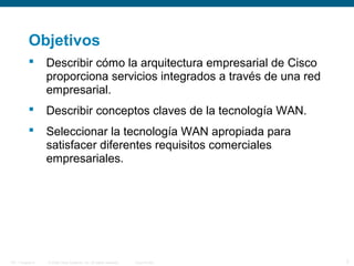 Una WAN es una red de comunicación de datos que opera más allá del alcance geográfico de una LAN. Las WAN operan en las capas 1 y 2 del modelo OSI. La arquitectura empresarial de Cisco expande el modelo de diseño jerárquico mediante la subdivisión de la red empresarial en las áreas física, lógica y funcional. La selección de una tecnología WAN requiere considerar su propósito, alcance geográfico, requerimientos de tráfico y si usará infraestructura pública o