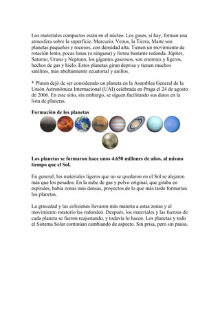 El Sistema Solar consiste en un grupo de objetos que giran alrededor del Sol, incluyendo 8 planetas. Los 4 planetas interiores son rocosos mientras que los 4 planetas exteriores son gigantes gaseosos. Los planetas se formaron hace aproximadamente 4,600 millones de años a partir de una nube de gas y polvo que colapsó para formar el Sol y el disco protoplanetario.