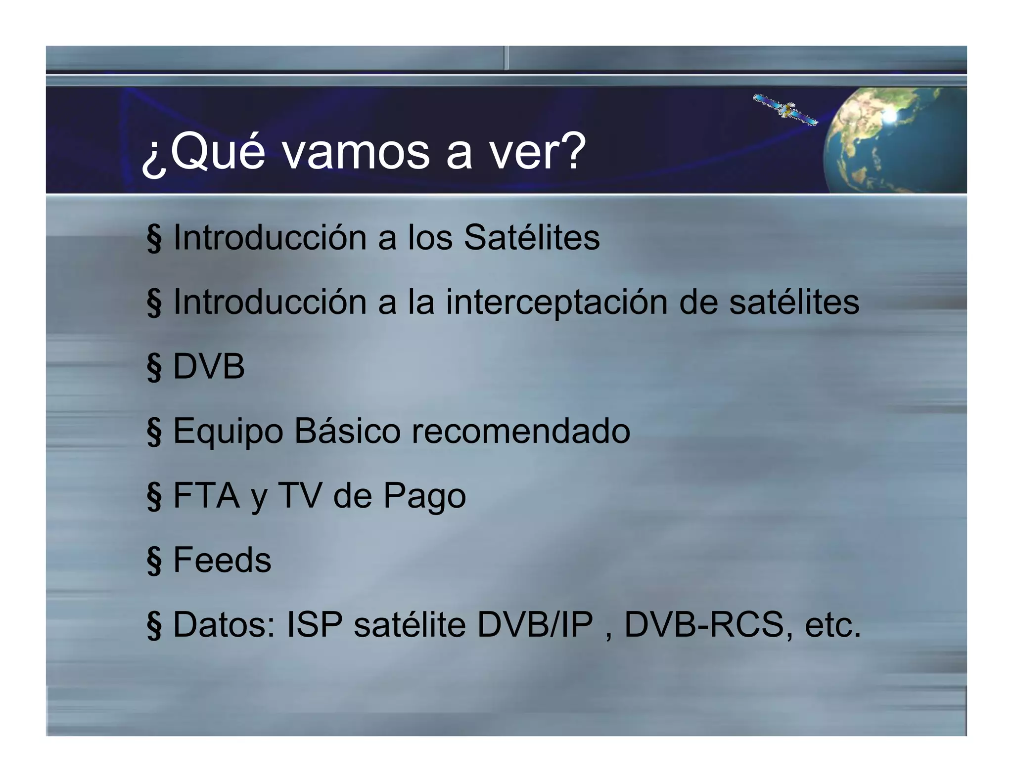 DVB permite la transmisión digital de video, audio y datos a través de satélite. El estándar DVB describe los protocolos para la transmisión de televisión digital por satélite (DVB-S), cable (DVB-C) y terrestre (DVB-T), así como la transmisión de datos (DVB-S2 e IP). El documento explica los conceptos básicos de DVB como multiplexación, transporte de streams y PIDs, y describe equipo y software para recibir canales FTA, feeds de video en directo y datos encapsulados a través de DVB-S e