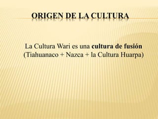 La cultura Wari se originó entre los años 500-1000 d.C. en la región de Huanta, Perú, como una cultura de fusión entre las culturas Nazca, Huarpa y Tiahuanaco. Los Wari expandieron su imperio desde Cajamarca hasta Moquegua e introdujeron importantes avances arquitectónicos e influyeron en las manifestaciones culturales como la cerámica y la religión en la zona andina.