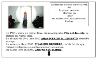 Waris Dirie, la primera modelo africana en tener un contrato exclusivo con Revlon, ha dedicado su vida a combatir la ablación femenina y a promover la educación en Somalia tras escapar de una vida de sufrimiento. Autora de varios libros, incluido 'Flor del desierto', relata su dolorosa infancia y su viaje hacia la reivindicación de los derechos de las mujeres. A través de su fundación, ha logrado que 15 países penalicen la mutilación femenina y continúa luchando por el respeto y la paz en el mundo.