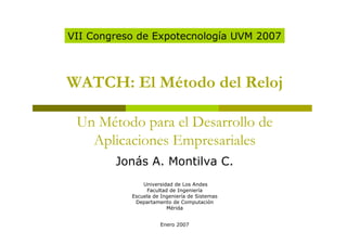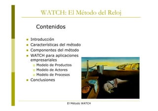 Este documento presenta el Método WATCH, un marco metodológico para el desarrollo de aplicaciones empresariales. El método está fundamentado en CMMI, RUP y PMBOK y se compone de tres modelos: un modelo de productos, un modelo de actores y un modelo de procesos. El modelo de procesos organiza las actividades de desarrollo en procesos técnicos, de gestión y de soporte siguiendo la metáfora de las manecillas de un reloj.