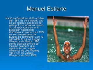 El documento presenta información biográfica y logros de varios jugadores destacados de waterpolo de España, Hungría, Italia e internacionales. Entre ellos se encuentran Manuel Estiarte, Guillermo Molina, Tibor Benedek, Rajmund Fodor, Jesús Rollán, Rafael Aguilar, Tamas Kasas, Tony Azevedo y Natalie Golda. Se resaltan sus participaciones olímpicas y en otros campeonatos, así como títulos obtenidos a nivel de clubes y selecciones nacionales.