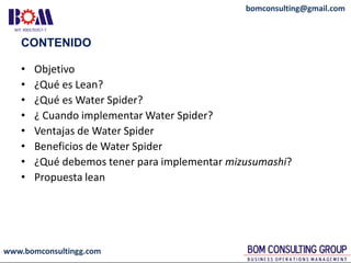 El documento describe el concepto de Water Spider (Mizusumashi) en Lean Manufacturing. Un Water Spider es una persona que suministra piezas y materiales a los operarios de una línea de producción para mantener el flujo continuo. Implementar un Water Spider reduce el tiempo que los operarios pasan buscando materiales y mejora la productividad al concentrarse en tareas de valor agregado.
