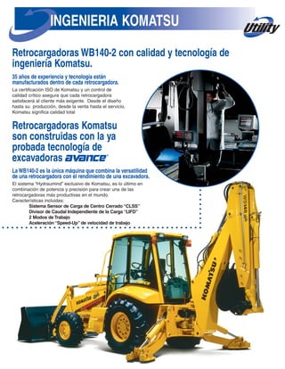 Este documento proporciona especificaciones e información técnica sobre la retroexcavadora Komatsu WB140-2. Tiene una potencia neta de 64.1 kW, un peso operativo de 7,585 kg y tracción en las 4 ruedas estándar. Incluye dimensiones, capacidades, equipamiento estándar y opcional. Destaca las características del sistema hidráulico "Hydraumind" de Komatsu, como el sensor de carga cerrado y el divisor de caudal independiente de la carga, que mejoran la eficiencia y el control.