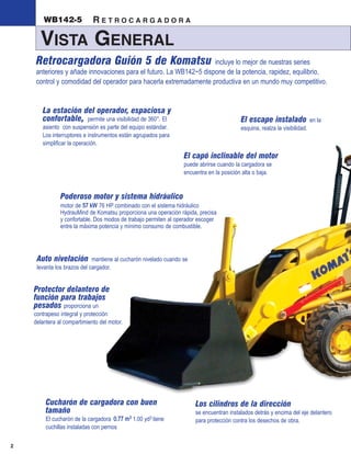 La retroexcavadora WB142-5 de Komatsu ofrece 57 kW de potencia neta, pesa 6585 kg y tiene una capacidad de cucharón de 0,77 m3. Proporciona una excelente visibilidad, comodidad para el operador y funcionamiento preciso gracias a su motor diesel, transmisión y sistema hidráulico.