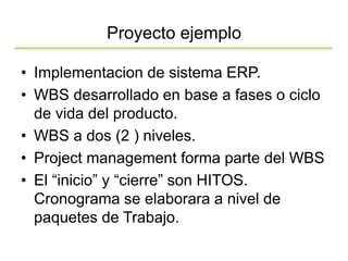 El documento proporciona una guía para desarrollar un cronograma de proyectos de manera estructurada. Explica cómo crear un WBS (Plan de Trabajo Estructurado) a varios niveles de detalle dividiendo el proyecto en paquetes de trabajo. Luego, utiliza un diagrama de red para secuenciar los paquetes de trabajo y finalmente genera un cronograma basado en el WBS y el diagrama de red.