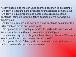 Windows Communication Foundation (WCF) es un marco de trabajo para la creación de aplicaciones orientadas a servicios que permite el intercambio de datos entre extremos de servicio de forma asincrónica a través de mensajes. WCF incluye características como orientación a servicios, interoperabilidad, diferentes modelos de mensajes, contratos de datos, seguridad, mensajes confiables y transacciones. Además, WCF se integra con otras tecnologías de Microsoft como Windows Workflow Foundation, BizTalk Server y Silverlight.