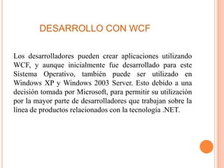 WCF (Windows Communication Foundation) es la plataforma de mensajería que forma parte de la API de .NET Framework 3.0. WCF permite crear aplicaciones orientadas a servicios mediante el uso de estándares como SOAP y HTTP. Ofrece características como interoperabilidad, seguridad, varios modelos de mensajería y compatibilidad con diferentes protocolos y formatos de datos.