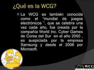 La WCG o World Cyber Games es un campeonato mundial de juegos electrónicos que se celebra anualmente desde el 2000 y es auspiciado por empresas como Samsung y Microsoft, reuniendo a jugadores de todo el mundo para competir en juegos populares de PC y consolas como Warcraft III, StarCraft, Counter-Strike, FIFA y más recientemente juegos para móviles.