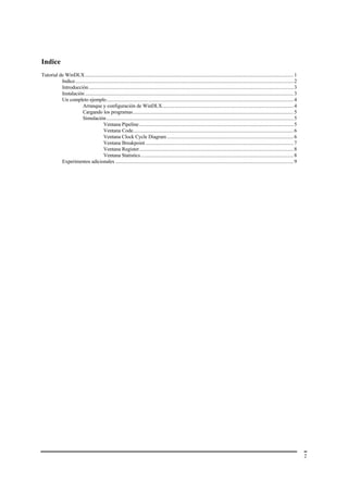 Este documento proporciona una introducción al uso del simulador WinDLX para simular el procesador DLX. Explica cómo instalar WinDLX, cargar programas de ensamblador en la memoria, ejecutar la simulación paso a paso utilizando diferentes ventanas como Pipeline, Code y Clock Cycle Diagram, y utilizar funciones como breakpoints. El objetivo es simular un programa que calcula el factorial de un número introducido por el usuario para ilustrar el funcionamiento del simulador.