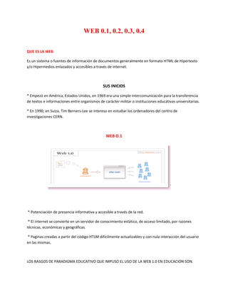 La web ha evolucionado desde su creación en 1969 como una red de comunicación militar y académica hasta convertirse en un sistema global de información hipertextual. La Web 1.0 permitió el acceso a información estática, mientras que la Web 2.0 introdujo la interactividad y participación de los usuarios. La Web semántica (Web 3.0) y el uso de la inteligencia artificial llevarán a la Web 4.0, donde los agentes en la web razonarán como las personas y las máquinas y objetos se comunicarán entre sí.