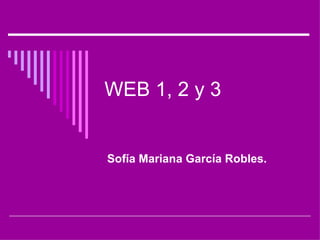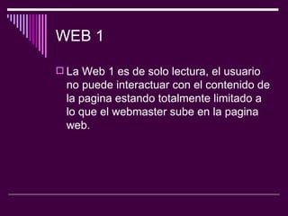 El documento resume las características de la Web 1, 2 y 3. La Web 1 es de solo lectura y el usuario no puede interactuar con el contenido. La Web 2 se refiere a una segunda generación basada en comunidades de usuarios y servicios que fomentan la colaboración. La Web 3 se refiere a la transformación de la red en una base de datos inteligente y el empuje de tecnologías como la inteligencia artificial y la web 3D.