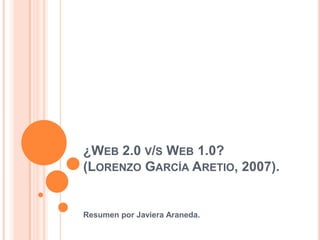 El documento contrasta las características de la Web 1.0 y la Web 2.0. La Web 1.0 era principalmente de lectura con páginas estáticas, mientras que la Web 2.0 permite la lectura y escritura con páginas dinámicas y contenidos abiertos. La Web 2.0 fomenta la interactividad, el aprendizaje colaborativo y la libertad de edición y difusión de contenido, convirtiendo a los usuarios en productores y creadores en lugar de solo consumidores.