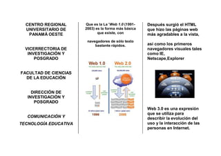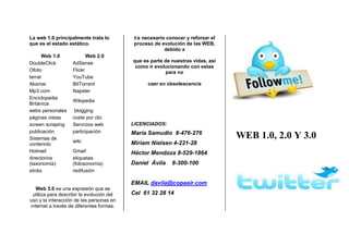 La Web 1.0 trata sobre contenido estático, mientras que la Web 2.0 se centra en la participación y colaboración de los usuarios a través de wikis, blogs y redes sociales. La Web 3.0 representa una evolución hacia una interacción más inteligente entre las personas y la red a través de diferentes formas.
