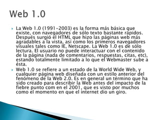 La Web 1.0 (1991-2003) permitía páginas web de sólo texto con navegadores básicos. El usuario no podía interactuar con el contenido. La Web 2.0 (a partir de 2001) representa la evolución hacia aplicaciones web enfocadas en el usuario, donde el usuario puede generar y editar contenido de forma colaborativa a través de blogs, wikis y redes sociales.