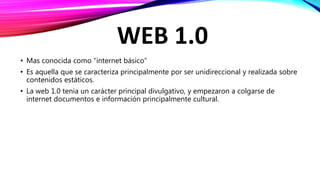 La Web 1.0 era unidireccional y contenía información estática principalmente cultural. La Web 2.0 permitía la inteligencia artificial y la compartición de conocimiento a través de redes sociales. La Web 3.0 es una web semántica e inteligente que aprovecha la nube para ofrecer servicios al usuario sin necesidad de sistemas operativos complejos.