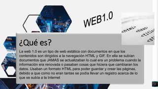 La Web 1.0 consistía en páginas estáticas creadas con HTML que rara vez se actualizaban. La Web 2.0 permitió a los usuarios interactuar y contribuir al contenido a través de blogs, redes sociales y wikis. La Web 3.0, también conocida como Web semántica, usa la inteligencia artificial para que las máquinas entiendan el significado del contenido y puedan procesar grandes cantidades de datos.