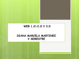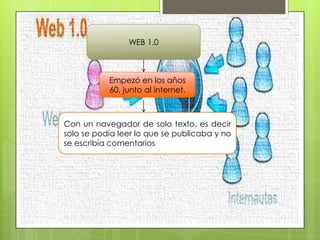 El documento resume la evolución de la web de 1.0 a 3.0, donde la web 1.0 solo permitía leer contenido de forma textual, la web 2.0 introdujo herramientas para la participación como redes sociales, blogs y wikis, y la web 3.0 busca mejorar las búsquedas mediante lenguaje más natural y semántica.
