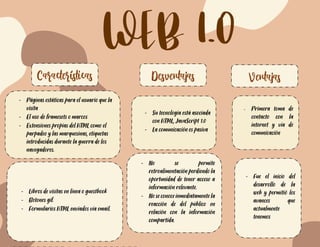 Este documento compara las características de la Web 1.0, 2.0 y 3.0. La Web 1.0 tenía páginas estáticas y era pasiva, pero permitió el inicio del desarrollo de la web. La Web 2.0 introdujo la interactividad y permitió compartir información desde cualquier dispositivo. La Web 3.0 permitirá búsquedas inteligentes a través de vinculación de datos y contenido libre en espacios tridimensionales y la nube.