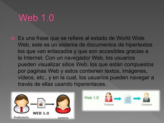 Este documento describe la evolución de la World Wide Web. Explica que la Web 1.0 se refiere al sistema original de documentos hipertextuales enlazados accesibles a través de Internet. Luego, la Web 2.0 se refiere a plataformas emergentes para publicar contenido como blogs, redes sociales y wikis. Finalmente, la Web 3.0 se refiere a una red donde los usuarios y dispositivos pueden interactuar mediante lenguaje natural interpretado por software.