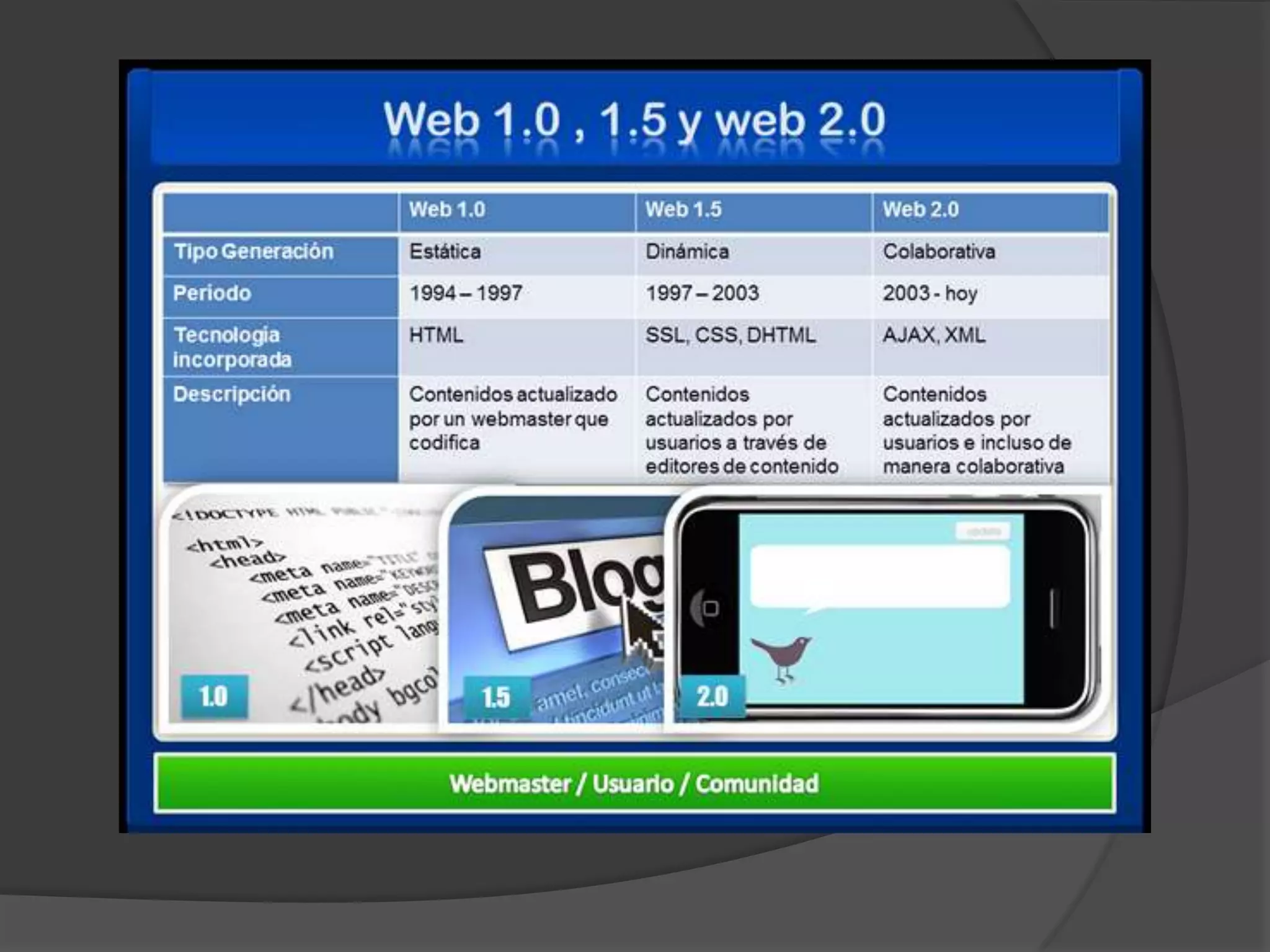 El documento discute las diferencias entre la Web 1.0 y la Web 2.0. Explica que la Web 2.0 permite una mayor interactividad y aprendizaje colaborativo entre los usuarios, al permitir que los usuarios sean consumidores y productores de contenido. También argumenta que la transición entre las versiones de la Web no fue abrupta, sino gradual, y que características sociales existían también en la Web 1.0 a través de foros y comentarios.