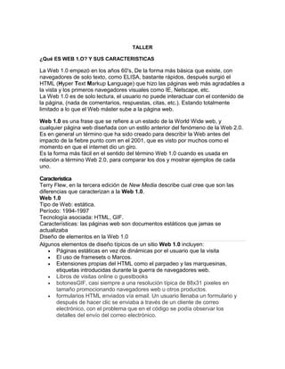 Este documento compara la Web 1.0 y la Web 2.0. La Web 1.0 consistía en páginas estáticas que no permitían interacción del usuario. La Web 2.0 fomenta la colaboración entre usuarios a través de blogs, wikis y redes sociales, donde los usuarios generan y comparten contenido de forma dinámica. Las características clave de la Web 2.0 incluyen contenido generado por los usuarios, roles activos de los usuarios, y la formación de comunidades en línea.