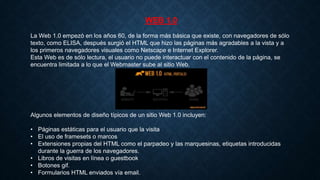La Web 1.0 permitía páginas estáticas y de sólo lectura, mientras que la Web 2.0 fomentó la participación activa de los usuarios para crear y compartir contenido. La Web 3.0 busca estructurar mejor la información para hacer búsquedas más rápidas y eficientes a través de tecnologías semánticas y de inteligencia artificial.