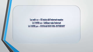 El documento resume la evolución de la World Wide Web desde sus inicios en la década de 1960 hasta la actualidad. Comenzó con navegadores de solo texto y luego el desarrollo del HTML permitió páginas más visuales. La Web 1.0 solo permitía lectura de contenido. La Web 2.0 introdujo interactividad a través de comentarios y redes sociales. La Web 3.0 se refiere a una mayor inteligencia y accesibilidad de los contenidos a través de aplicaciones y tecnologías como la inteligencia artificial.