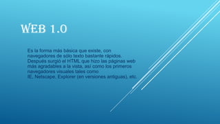 El documento compara la Web 1.0 y la Web 2.0. La Web 1.0 consistía en páginas web estáticas con contenido unidireccional, mientras que la Web 2.0 facilita el compartir información y la colaboración entre usuarios para crear contenido, permitiendo la interacción y participación activa. La Web 2.0 transforma a los usuarios en productores de contenido a través de tecnologías más avanzadas.