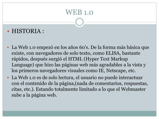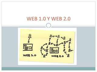 Este documento compara la Web 1.0 y la Web 2.0. Explica que la Web 1.0 era estática y de solo lectura, mientras que la Web 2.0 permite una mayor interacción entre usuarios a través de blogs, redes sociales y otras herramientas que facilitan la publicación y el intercambio de contenido.