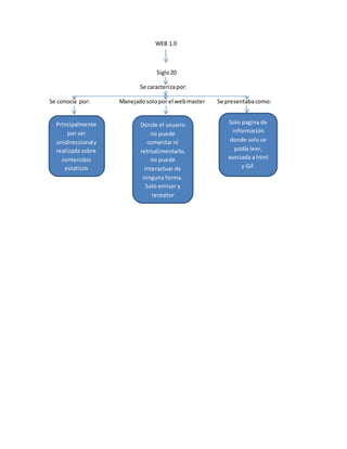 El documento contrasta la Web 1.0 y la Web 2.0. La Web 1.0 se caracterizaba por ser unidireccional y estática, donde solo el webmaster podía publicar contenido y los usuarios solo podían leer sin interactuar. La Web 2.0 surgió en 2003-2004 y se caracteriza por permitir que los usuarios interactúen y sean productores de contenido a través de herramientas sociales como Wikipedia, YouTube, Flickr y blogs.